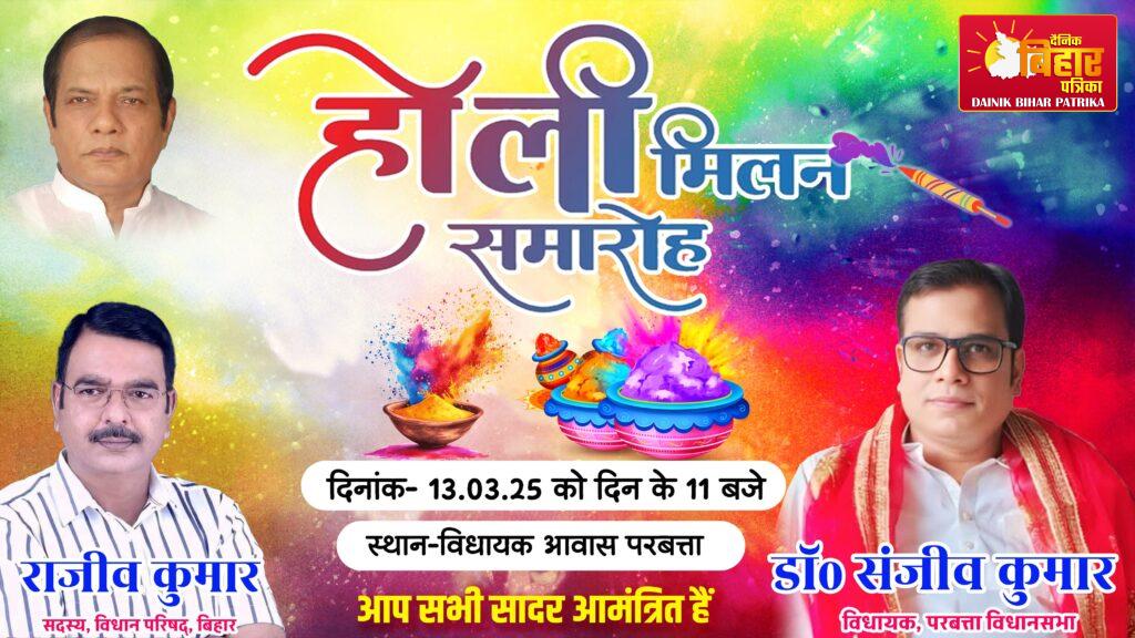 परबत्ता (खगड़िया)। रंगों और उल्लास के महापर्व होली के अवसर पर परबत्ता विधानसभा क्षेत्र के विधायक डॉ. संजीव कुमार के आवास पर भव्य होली मिलन समारोह का आयोजन किया गया है। यह आयोजन 13 मार्च 2025, बृहस्पतिवार को सुबह 11 बजे से प्रारंभ होगा, जिसमें क्षेत्र के गणमान्य लोग, सामाजिक कार्यकर्ता, जनप्रतिनिधि और आम नागरिकों के शामिल होने की संभावना है।