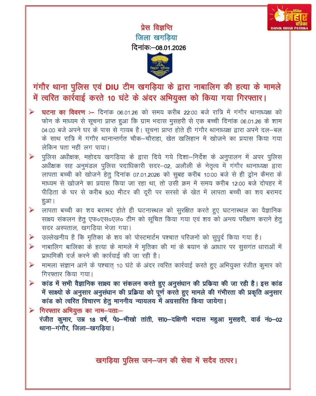 मृतिका की मां के बयान के आधार पर सुसंगत धाराओं में प्राथमिकी दर्ज करने की प्रक्रिया की जा रही है। मामले की गंभीरता को देखते हुए पुलिस ने त्वरित कार्रवाई करते हुए 10 घंटे के भीतर आरोपी रंजीत कुमार (उम्र 18 वर्ष), पिता—भीखो तांती, निवासी—दक्षिणी भदास महुआ मुसहरी, वार्ड संख्या-02, थाना गंगौर, जिला खगड़िया को गिरफ्तार कर लिया। पुलिस द्वारा सभी वैज्ञानिक साक्ष्यों के आधार पर अनुसंधान की प्रक्रिया जारी है तथा जांच पूर्ण कर मामले को त्वरित विचारण हेतु माननीय न्यायालय में प्रस्तुत किया जाएगा।